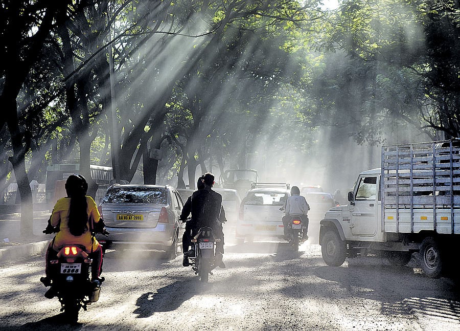 ಮಡಿವಾಳದ ಮಾರುಕಟ್ಟೆ ರಸ್ತೆಯಲ್ಲಿ ಮಂಗಳವಾರ ಮುಸ್ಸಂಜೆ ಹೊತ್ತು. ಕೆಳಗೆ ಹಾಳಾಗಿದ್ದ ರಸ್ತೆಯಲ್ಲಿ ವಾಹನಗಳ ಓಡಾಟದಿಂದ ದೂಳು ಮೇಲೆದ್ದರೆ, ಮೇಲೆ ಮರದ ಕೊಂಬೆಗಳ ನಡುವಿನಿಂದ ಸೂರ್ಯನ ಕಿರಣಗಳು ನುಸುಳಿ ಆ ರಸ್ತೆಗೆ ಮುತ್ತಿಕ್ಕುತ್ತಿದ್ದವು. ದೂಳುಮಯ ಆಗಿದ್ದ ಈ ವಾತಾವರಣ ವಾಹನ ಸವಾರರಿಗೆ ಸಂಕಷ್ಟ ತಂದರೂ ದೂರದಿಂದ ನೋಡುತ್ತಿದ್ದವರಿಗೆ ಅಲ್ಲಿನ ನೋಟ ಒಂದು ಕಲಾಕೃತಿಯಂತೆ ಗೋಚರಿಸಿತು ಪ್ರಜಾವಾಣಿ ಚಿತ್ರ: ಸತೀಶ್‌ ಬಡಿಗೇರ್‌