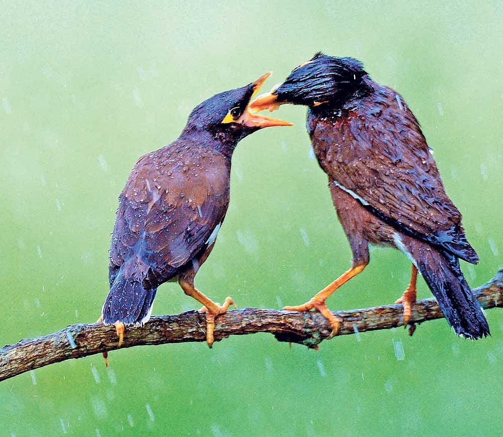 ಬೆಂಗಳೂರು ಬಳಿಯ ಕನಕಪುರ ರಸ್ತೆಯ ತಾತಗುಣಿ ಎಸ್ಟೇಟ್ನಲ್ಲಿ ಬುಧವಾರ ಮಳೆ ಸುರಿಯುತ್ತಿದ್ದಾಗ ಮೈನಾ ಜೋಡಿಯೊಂದು ಸಹಭೋಜನದಲ್ಲಿ ತೊಡಗಿತ್ತು. ದೂರದಿಂದ ‘ಊಟ’ ತಂದಿದ್ದ ಮೈನಾ ತನ್ನ ಸಂಗಾತಿಗೆ ಅದನ್ನು ಅಕ್ಕರೆಯಿಂದ ಉಣಿಸುತ್ತಿದ್ದ ಆ ನೋಟ ಮಳೆಯಿಂದ ರಕ್ಷಣೆ ಪಡೆಯಲು ಮರದ ಆಶ್ರಯ ಪಡೆದಿದ್ದವರಿಗೆ ಮುದ ನೀಡಿತು.– ಪ್ರಜಾವಾಣಿ ಚಿತ್ರ/ ವಿಶ್ವನಾಥ್ ಸುವರ್ಣ