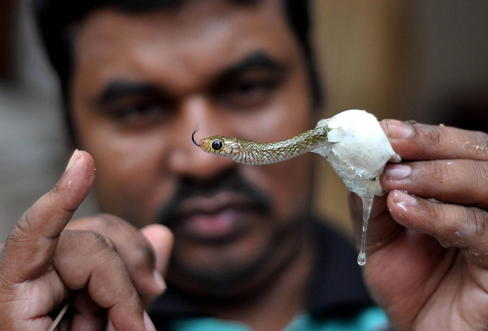 ಭುವನೇಶ್ವರದಲ್ಲಿ ಮೊಟ್ಟೆಯಿಂದ ಹೊರಬಂದ ಮರಿ ಹಾವನ್ನು ಭಾರತೀಯ ಉರಗ ಸಂಶೋಧಕ ಸುಭೆಂದು ಮಲ್ಲಿಕ್‌ ಹಿಡಿದಿರುವ ದೃಶ್ಯ –ಎಎಫ್‌ಪಿ ಚಿತ್ರ
