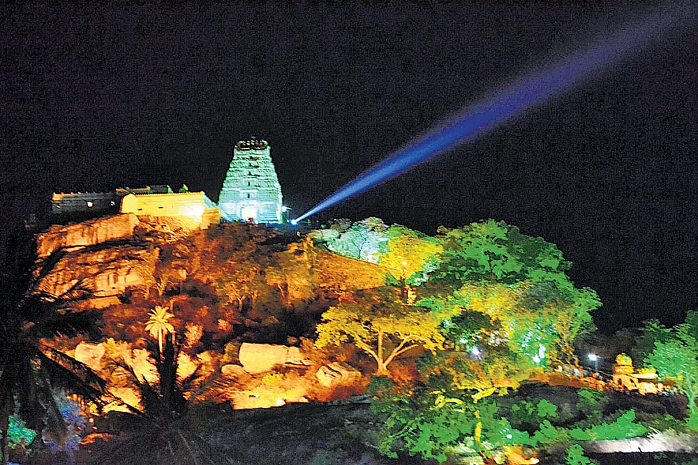 ಮಂಡ್ಯ ಜಿಲ್ಲೆಯ ಮೇಲುಕೋಟೆಯ ಬೆಟ್ಟದ ಯೋಗನರಸಿಂಹ ಸ್ವಾಮಿ ದೇವಸ್ಥಾನದ ವಿದ್ಯುತ್ ದೀಪ ಅಲಂಕಾರದ ದೃಶ್ಯ ಇದು. ದಕ್ಷಿಣ ಬದರೀಕಾಶ್ರಮ, ಯದುಗಿರಿ ಎಂದೇ ಪ್ರಸಿದ್ಧಿಯಾದ ಮೇಲುಕೋಟೆಯಲ್ಲಿ ಚಲುವನಾರಾಯಣಸ್ವಾಮಿಯ ವಿಶ್ವವಿಖ್ಯಾತ ವೈರಮುಡಿ ಉತ್ಸವದ ಸಂಭ್ರಮಕ್ಕೆ ಸೋಮವಾರ ಲಕ್ಷಾಂತರ ಭಕ್ತರು ಸಾಕ್ಷಿಯಾದರು. ಭಗವಂತನ ಕಿರೀಟವೆಂದೇ ಕರೆಯಲಾಗುವ ವಜ್ರಖಚಿತ ವೈರಮುಡಿ ಕಿರೀಟವನ್ನು ಧರಿಸಿದ ಚಲುವನಾರಾಯಣಸ್ವಾಮಿ ದರ್ಶನ ಪಡೆದು ಪುನೀತರಾದರು. ಪ್ರಜಾವಾಣಿ ಚಿತ್ರ