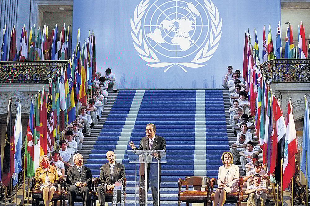 ವಿಶ್ವಸಂಸ್ಥೆ ಸ್ಥಾಪನಾ ಘೋಷಣೆಗೆ ಸಹಿ ಹಾಕಿದ 70ನೇ ವರ್ಷಾಚರಣೆ ಪ್ರಯುಕ್ತ ಶನಿವಾರ ಸ್ಯಾನ್‌ಫ್ರಾನ್ಸಿಸ್ಕೊದಲ್ಲಿ ನಡೆದ ಕಾರ್ಯಕ್ರಮದಲ್ಲಿ ವಿಶ್ವಸಂಸ್ಥೆ ಮಹಾಪ್ರಧಾನ ಕಾರ್ಯದರ್ಶಿ ಬಾನ್‌ ಕಿ ಮೂನ್‌ ಮಾತನಾಡಿದರು -ರಾಯಿಟರ್ಸ್‌ ಚಿತ್ರ