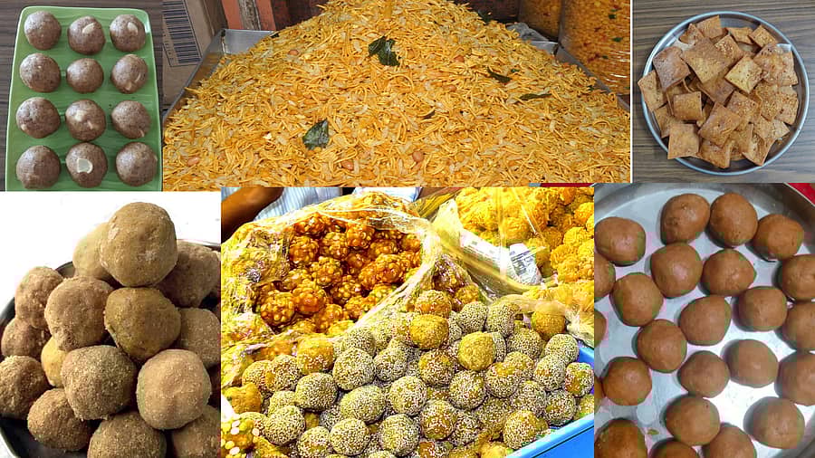 ಅವಲಕ್ಕಿ ಚೂಡಾ, ಚುರುಮುರಿ ಚೂಡಾ ಕಾಯಂ ಇರುತ್ತವೆ. ಜೊತೆಗೆ ಚಕ್ಕುಲಿ, ಕೋಡುಬಳೆ, ಎಳ್ಳುಂಡೆ, ಬೇಸನ್ ಉಂಡೆ, ಹೆಸರುಂಡೆ, ಶೇಂಗಾ ದುಂಡಿ, ಗೋದಿ ಹಿಟ್ಟಿನ ಉಂಡೆಗಳಿಗೂ ಕಾಯಂ ಜಾಗ.