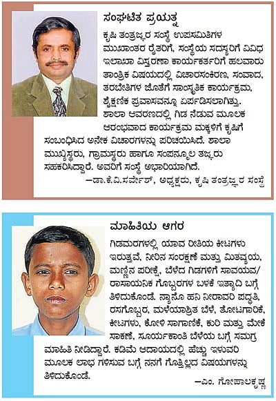 ‘ಶಾಲಾ ವಿದ್ಯಾರ್ಥಿಗಳು, ಪೋಷಕರು ಮತ್ತು ಮುಖ್ಯೋಪಾಧ್ಯಾಯರೊಂದಿಗೆ ಚರ್ಚಿಸಿ ವಿಷಯವನ್ನು ಆರಿಸಲಾಗುತ್ತದೆ. ಕೃಷಿ, ತೋಟಗಾರಿಕೆ, ವಿವಿಗಳಲ್ಲಿ ಸೇವಾನಿರತರು ಮತ್ತು ನಿವೃತ್ತ ತಜ್ಞರು ಶಾಲೆಗಳಿಗೆ ತೆರಳಿ ಮಕ್ಕಳಿಗೆ ಕೃಷಿ ಮಾಹಿತಿ ನೀಡಿರುತ್ತಾರೆ. ತರಕಾರಿ, ಹೂ, ತೆಂಗು, ಬಾಳೆ ಮುಂತಾದ ಬೆಳೆಗಳ ಬಗ್ಗೆಯೂ ಮಾಹಿತಿ ನೀಡಲಾಗಿದೆ’ ಎನ್ನುತ್ತಾರೆ, ಸಂಸ್ಥೆಯ ಸಹ ಅಧ್ಯಕ್ಷ ಚನ್ನಬಸವಯ್ಯ.
