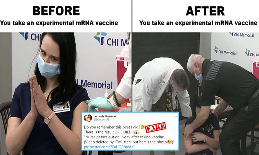 ಅಮೆರಿಕದಲ್ಲಿ ಫೈಝರ್ ಕೋವಿಡ್ ಲಸಿಕೆ ಹಾಕಿಸಿಕೊಂಡ ನರ್ಸ್ ಕೆಲವೇ ನಿಮಿಷಗಳಲ್ಲಿ ಕುಸಿದು ಮೃತಪಟ್ಟಿದ್ದಾರೆ ಎಂಬ ಸುದ್ದಿ ಸಾಮಾಜಿಕ ಜಾಲತಾಣಗಳಲ್ಲಿ ಹರಿದಾಡುತ್ತಿದೆ. ಅವರು ಕುಸಿದು ಬೀಳುತ್ತಿರುವ ದೃಶ್ಯ ಎಂದು ಹೇಳಲಾದ ವಿಡಿಯೊ ಕೂಡ ವೈರಲ್ ಆಗಿದೆ.