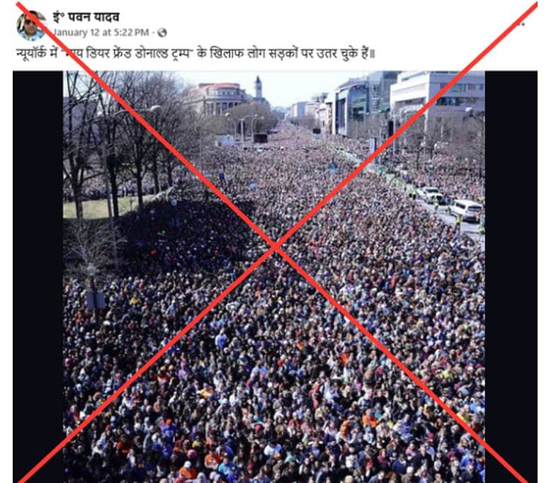 ಬೀದಿಯಲ್ಲಿ ಬೃಹತ್ ಸಂಖ್ಯೆಯ ಜನ ನೆರೆದಿರುವ ಚಿತ್ರವೊಂದು ಸಾಮಾಜಿಕ ಜಾಲತಾಣಗಳಲ್ಲಿ ಹರಿದಾಡುತ್ತಿದೆ. ಅಮೆರಿಕದ ಅಧ್ಯಕ್ಷ ಡೊನಾಲ್ಡ್ ಟ್ರಂಪ್ ಅವರ ವಿರುದ್ಧ ನ್ಯೂಯಾರ್ಕ್ ನಗರದಲ್ಲಿ ಜನರು ಭಾರಿ ಪ್ರತಿಭಟನೆ ನಡೆಸಿದರು ಎಂದು ಕೆಲವರು ಚಿತ್ರವನ್ನು ಹಂಚಿಕೊಳ್ಳುವ ಮೂಲಕ ಪ್ರತಿಪಾದಿಸುತ್ತಿದ್ದಾರೆ. ಆದರೆ, ಈ ಸುದ್ದಿ ವಾಸ್ತವ ಅಲ್ಲ.
