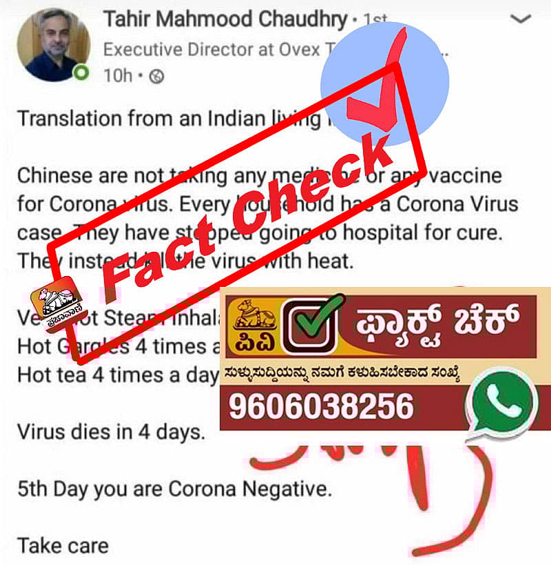 ‘ಚೀನಾದ ಪ್ರತಿ ಮನೆಯಲ್ಲೂ ಕೊರೊನಾ ವೈರಸ್ ಇದೆ. ಆದರೆ, ಅಲ್ಲಿಯ ಜನರು ಔಷಧ ಅಥವಾ ಲಸಿಕೆಯನ್ನು ತೆಗೆದುಕೊಳ್ಳುತ್ತಿಲ್ಲ. ಆಸ್ಪತ್ರೆಗೂ ಹೋಗುವುದಿಲ್ಲ. ಬದಲಿಗೆ ಅವರು ಬಿಸಿ ಹಬೆಯನ್ನು ಉಸಿರಾಡುವುದು, ಬಿಸಿನೀರಿನಿಂದ ಬಾಯಿ ಮುಕ್ಕಳಿಸುವುದು, ಹಾಗೂ ಬಿಸಿ ಚಹಾ ಸೇವನೆಯ ಮೂಲಕ ಗುಣಮುಖರಾಗುತ್ತಿದ್ದಾರೆ. ಇವುಗಳನ್ನು ದಿನಕ್ಕೆ ತಲಾ ನಾಲ್ಕುಬಾರಿ ಮಾಡಿದರೆ ನಾಲ್ಕು ದಿನಗಳಲ್ಲಿ ಕೊರೊನಾ ವೈರಸ್ ಸಾಯುತ್ತದೆ, ಐದನೇ ದಿನ ನೀವು ಕೊರೊನಾದಿಂದ ಮುಕ್ತರಾಗುತ್ತೀರಿ’ ಎಂಬ ಸಂದೇಶವೊಂದು ಜಾಲತಾಣಗಳಲ್ಲಿ ಹರಿದಾಡುತ್ತಿದೆ.