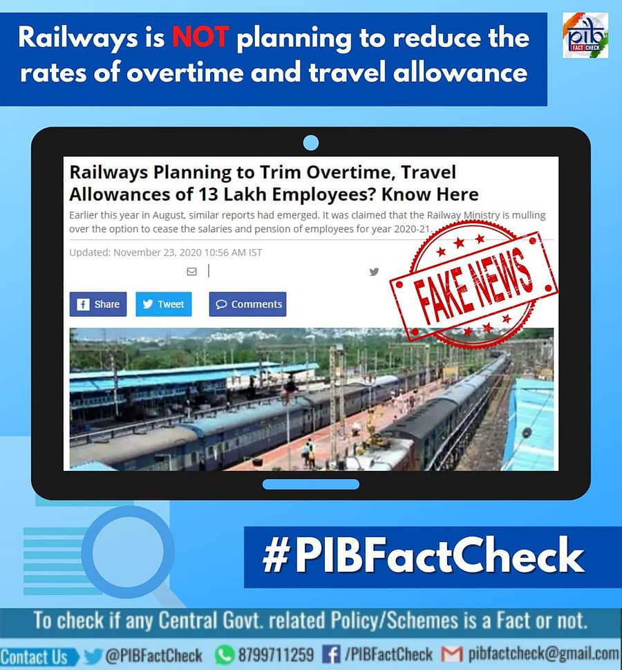 ಪತ್ರಿಕೆಗಳಲ್ಲಿ ಪ್ರಕಟವಾಗಿರುವ ಸುದ್ದಿ ಸುಳ್ಳು ಎಂದು ಪಿಐಬಿ ಫ್ಯಾಕ್ಟ್ ಚೆಕ್ ತಿಳಿಸಿದೆ. ಸಚಿವಾಲಯವು ಒಟಿ ಹಾಗೂ ಟಿಎ ಕಡಿತಗೊಳಿಸುವ ಯಾವುದೇ ನಿರ್ಧಾರ ತೆಗೆದುಕೊಂಡಿಲ್ಲ ಎಂದು ಸ್ಪಷ್ಟಪಡಿಸಿದೆ.