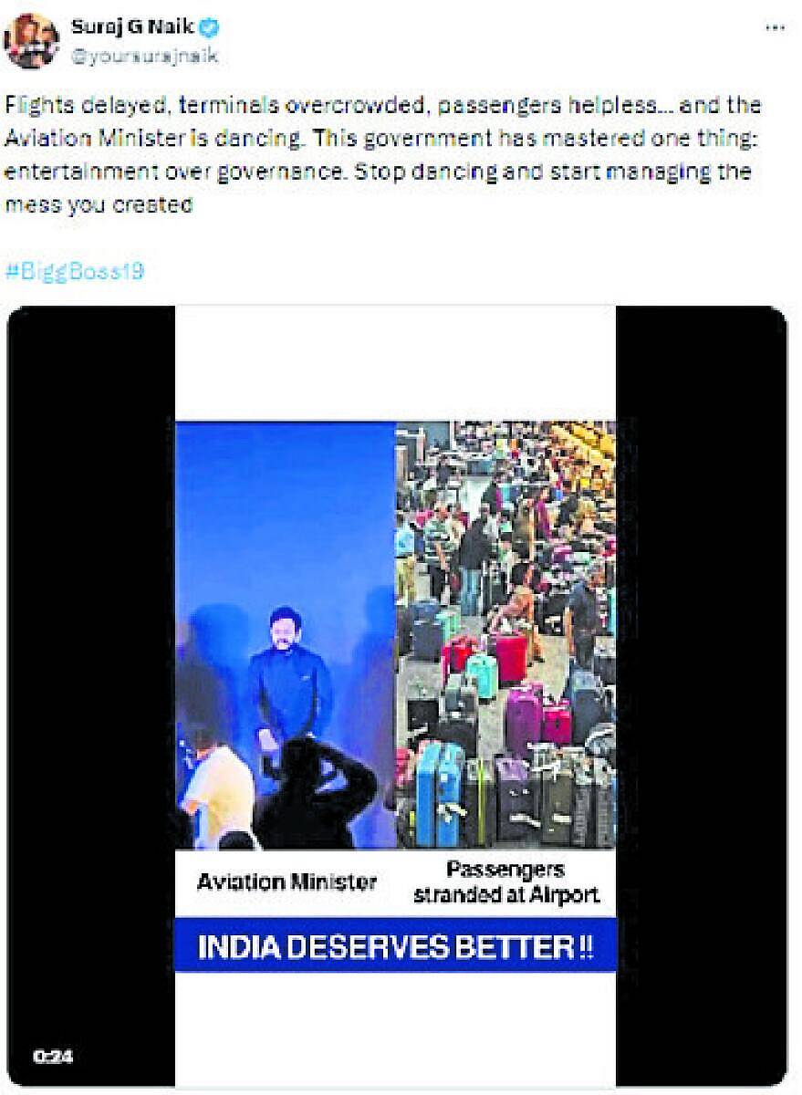ಕೇಂದ್ರ ನಾಗರಿಕ ವಿಮಾನಯಾನ ಸಚಿವ ಕೆ.ರಾಮ್ ಮೋಹನ್ ನಾಯ್ಡು ಅವರು ವೇದಿಕೆಯೊಂದರಲ್ಲಿ ನೃತ್ಯ ಮಾಡುತ್ತಿರುವ ವಿಡಿಯೊವನ್ನು ‘ಎಕ್ಸ್’ ಬಳಕೆದಾರರೊಬ್ಬರು ಪೋಸ್ಟ್ ಮಾಡಿದ್ದಾರೆ. ‘ಇಂಡಿಗೊ ಬಿಕ್ಕಟ್ಟಿನಿಂದಾಗಿ ವಿಮಾನಗಳ ಹಾರಾಟ ವಿಳಂಬವಾಗಿರುವಾಗ, ವಿಮಾನ ನಿಲ್ದಾಣಗಳು ಪ್ರಯಾಣಿಕರಿಂದ ತುಂಬಿ ತುಳುಕುತ್ತಿರುವಾಗ ವಿಮಾನಯಾನ ಸಚಿವ ನೃತ್ಯ ಮಾಡುತ್ತಿದ್ದಾರೆ. ಈ ಸರ್ಕಾರಕ್ಕೆ ಆಡಳಿತಕ್ಕಿಂತಲೂ ಮನರಂಜನೆಯೇ ಮುಖ್ಯ. ನೃತ್ಯ ನಿಲ್ಲಿಸಿ, ನೀವು ಸೃಷ್ಟಿಸಿರುವ ಗೊಂದಲವನ್ನು ಸರಿಪಡಿಸಿ’ ಎಂದು ಆ ಪೋಸ್ಟ್ನಲ್ಲಿ ಹೇಳಲಾಗಿದೆ. ಆದರೆ, ಇದು ಸುಳ್ಳು.
