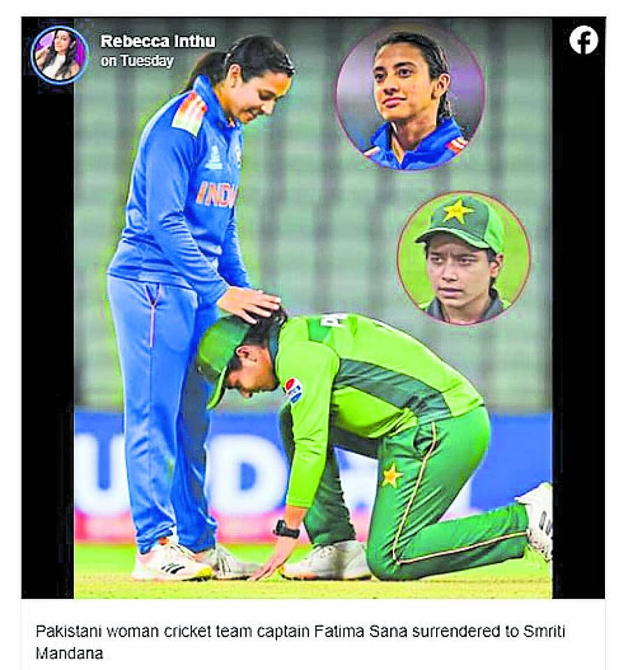 ಐಸಿಸಿ ಮಹಿಳಾ ವಿಶ್ವಕಪ್ಗೆ ಸಂಬಂಧಿಸಿದ ಚಿತ್ರವೊಂದು ಸಾಮಾಜಿಕ ಜಾಲತಾಣಗಳಲ್ಲಿ ಹರಿದಾಡುತ್ತಿದೆ. ಐಸಿಸಿ ಮಹಿಳಾ ವಿಶ್ವಕಪ್ನ 2025 ಅ.5ರ ಪಂದ್ಯದ ವೇಳೆ ಪಾಕಿಸ್ತಾನ ಕ್ರಿಕೆಟ್ ತಂಡದ ಕ್ಯಾಪ್ಟನ್ ಫಾತಿಮಾ ಸನಾ ಅವರು ಭಾರತ ತಂಡದ ಆಟಗಾರ್ತಿ ಸ್ಮೃತಿ ಮಂದಾನ ಅವರ ಮುಂದೆ ಮೊಣಕಾಲೂರಿ ಅವರ ಪಾದ ಸ್ಪರ್ಶಿಸಿದರು ಎಂದು ಚಿತ್ರವನ್ನು ಹಂಚಿಕೊಳ್ಳುತ್ತಿರುವವರು ಪ್ರತಿಪಾದಿಸುತ್ತಿದ್ದಾರೆ. ಆದರೆ, ಇದು ಸುಳ್ಳು ಸುದ್ದಿ.