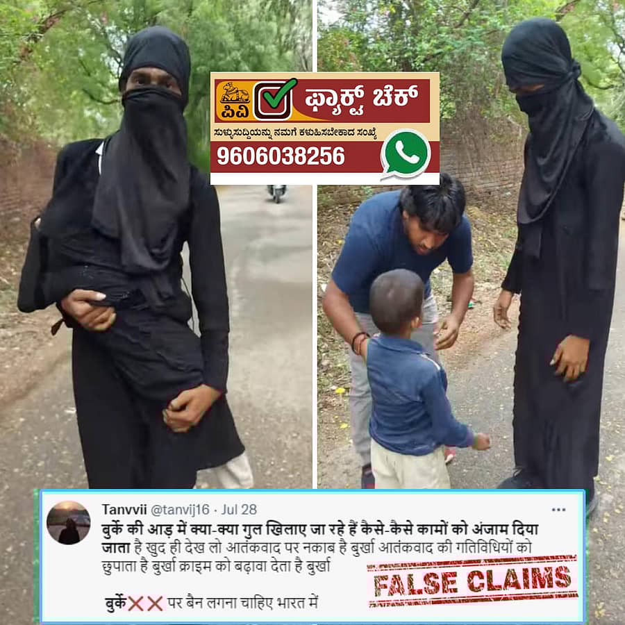 ಬುರ್ಖಾಧಾರಿಯೊಬ್ಬರು ಮಗುವೊಂದನ್ನು ಬುರ್ಖಾದೊಳಗೆ ಬಚ್ಚಿಟ್ಟುಕೊಂಡು ಓಡಿ ಹೋಗುತ್ತಿರುವ ಮತ್ತು ವ್ಯಕ್ತಿಯೊಬ್ಬರು ಕಾರಿನಲ್ಲಿ ಅವರನ್ನು ಹಿಂಬಾಲಿಸುತ್ತಿರುವ ದೃಶ್ಯವಿರುವ ವಿಡಿಯೊ ಸಾಮಾಜಿಕ ಜಾಲತಾಣಗಳಲ್ಲಿ ವೈರಲ್ ಆಗಿದೆ. ಕಾರಿನಲ್ಲಿದ್ದ ವ್ಯಕ್ತಿ ಮತ್ತು ಇನ್ನೊಬ್ಬ ಮಹಿಳೆಯು, ಬುರ್ಖಾಧಾರಿಯನ್ನು ಹಿಡಿಯುತ್ತಾರೆ. ಆಗ ಬುರ್ಖಾ ಧರಿಸಿದ್ದದ್ದು ಪುರುಷ ಎಂಬುದು ಗೊತ್ತಾಗುತ್ತದೆ. ‘ಈ ಘಟನೆ ಮಧ್ಯಪ್ರದೇಶದಲ್ಲಿ ನಡೆದಿದೆ. ಬುರ್ಖಾಧಾರಿಗಳು ಮಕ್ಕಳ ಕಳ್ಳರು. ಹೀಗಾಗಿ ಅವರ ಬಗ್ಗೆ ಎಚ್ಚರದಿಂದ ಇರಿ’ ಎಂಬ ಸಂದೇಶವನ್ನು ವಿಡಿಯೊ ಜತೆಗೆ ಹಂಚಿಕೊಳ್ಳಲಾಗಿದೆ. ಕೆಲವರು ಬುರ್ಖಾವನ್ನು ನಿಷೇಧ ಮಾಡಿ ಎಂದು ಆಗ್ರಹಿಸಿದ್ದಾರೆ.