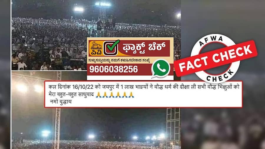 ಇದೇ 6ರಂದು ದೆಹಲಿಯಲ್ಲಿ ನೂರಾರು ದಲಿತರು ಬೌದ್ಧ ಧರ್ಮ ದೀಕ್ಷೆ ಪಡೆದ ಸುದ್ದಿಯ ಬೆನ್ನಲ್ಲೇ, ರಾಜಸ್ಥಾನದ ಜೈಪುರದಲ್ಲಿ ಸಾಮೂಹಿಕ ಮತಾಂತರ ಕಾರ್ಯಕ್ರಮ ನಡೆದಿದೆ ಎಂಬುದಾಗಿ ಸಾಮಾಜಿಕ ಜಾಲತಾಣಗಳಲ್ಲಿ ಚರ್ಚೆಯಾಗುತ್ತಿದೆ. ಬೃಹತ್ ಸಂಖ್ಯೆಯ ಜನರು ಸೇರಿರುವ ಎರಡು ಚಿತ್ರಗಳು ವೈರಲ್ ಆಗಿವೆ. ‘ಅ.16ರಂದು ನಡೆದ ಕಾರ್ಯಕ್ರಮದಲ್ಲಿ ಸುಮಾರು ಒಂದು ಲಕ್ಷ ಜನರು ಬೌದ್ಧ ಧರ್ಮದ ದೀಕ್ಷೆ ಪಡೆದಿದ್ದಾರೆ’ ಎಂದು ಉಲ್ಲೇಖಿಸಲಾಗಿದೆ. ಆದರೆ ಇದು ಸುಳ್ಳು ಸುದ್ದಿ.
