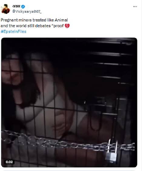 ಪಂಜರದೊಳಗೆ ಗರ್ಭಿಣಿ ಮಹಿಳೆಯನ್ನು ಕೂಡಿ ಹಾಕಿರುವ ವಿಡಿಯೊ ತುಣುಕೊಂದನ್ನು ’ಎಕ್ಸ್’ ಖಾತೆದಾರರೊಬ್ಬರು ಹಂಚಿಕೊಂಡಿದ್ದು, ಅದನ್ನು ಎಪ್ಸ್ಟೈನ್ ಫೈಲ್ಸ್ಗೆ ತಳಕು ಹಾಕಿದ್ದಾರೆ. ‘ಗರ್ಭಿಣಿ ಬಾಲಕಿಯರನ್ನು ಪ್ರಾಣಿಗಳ ರೀತಿಯಲ್ಲಿ ನೋಡಲಾಗಿದೆ. ಮತ್ತು ಜಗತ್ತು ಈಗಲೂ ‘ಸಾಕ್ಷ್ಯ’ದ ಬಗ್ಗೆ ಚರ್ಚೆ ಮಾಡುತ್ತಿದೆ’ ಎಂದು ಆ ಪೋಸ್ಟ್ನಲ್ಲಿ ಹೇಳಲಾಗಿದೆ. ನಂತರ ಹ್ಯಾಶ್ಟ್ಯಾಗ್ ಹಾಕಿ ಎಪ್ಸ್ಟೈನ್ಫೈಲ್ಸ್ ಎಂದು ಬರೆಯಲಾಗಿದೆ. ಆದರೆ, ಇದು ಸುಳ್ಳು.
