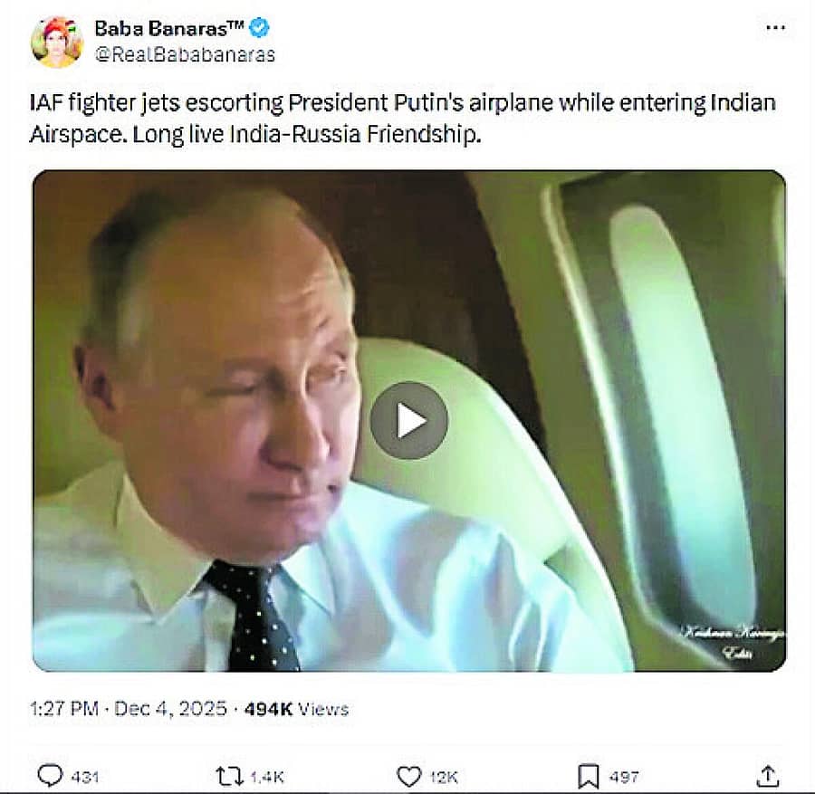 ರಷ್ಯಾ ಅಧ್ಯಕ್ಷ ವ್ಲಾದಿಮಿರ್ ಪುಟಿನ್ ಅವರು ಇತ್ತೀಚೆಗೆ ಭಾರತಕ್ಕೆ ಭೇಟಿ ನೀಡಿದ ಸಂದರ್ಭದಲ್ಲಿ ಅವರ ವಿಮಾನವು ಭಾರತದ ವಾಯುಪ್ರದೇಶ ಪ್ರವೇಶಿಸಿದ ನಂತರ ಭಾರತೀಯ ವಾಯು ಪಡೆಯ ಯುದ್ಧ ವಿಮಾನಗಳು ಅವರ ವಿಮಾನಕ್ಕೆ ಬೆಂಗಾವಲಾಗಿ ಹಾರಾಟ ನಡೆಸಿದ್ದವು ಎಂದು ಪ್ರತಿಪಾದಿಸುತ್ತಾ, ಪುಟಿನ್ ಅವರು ವಿಮಾನದಿಂದ ಬೆಂಗಾವಲಾಗಿ ಹಾರಾಟ ನಡೆಸುತ್ತಿದ್ದ ಯುದ್ಧ ವಿಮಾನಗಳನ್ನು ವೀಕ್ಷಿಸುತ್ತಿರುವ ವಿಡಿಯೊವೊಂದನ್ನು ಬಳಕೆದಾರರೊಬ್ಬರು ‘ಎಕ್ಸ್’ನಲ್ಲಿ ಪೋಸ್ಟ್ ಮಾಡಿದ್ದಾರೆ. ಅದನ್ನು ಹಲವರು ಹಂಚಿಕೊಳ್ಳುತ್ತಿದ್ದಾರೆ. ಆದರೆ, ಇದು ಸುಳ್ಳು. ಅದು ಭಾರತಕ್ಕೆ ಸಂಬಂಧಿಸಿದ್ದಲ್ಲ.