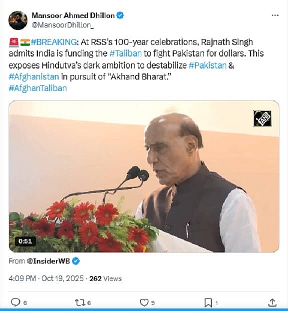 ‘ಪಾಕಿಸ್ತಾನದ ವಿರುದ್ಧ ಹೋರಾಡುವುದಕ್ಕಾಗಿ ಅಫ್ಗಾನಿಸ್ತಾನದ ತಾಲಿಬಾನ್ ಆಡಳಿತಕ್ಕೆ ಭಾರತ ಹಣಕಾಸಿನ ನೆರವು ನೀಡಿದೆ ಎಂದು ರಕ್ಷಣಾ ಸಚಿವ ರಾಜನಾಥ ಸಿಂಗ್ ಅವರು ಆರ್ಎಸ್ಎಸ್ನ ಶತಮಾನೋತ್ಸವ ಆಚರಣೆಯಲ್ಲಿ ಹೇಳಿದ್ದಾರೆ. ಅಫ್ಗಾನಿಸ್ತಾನ ಮತ್ತು ಪಾಕಿಸ್ತಾನವನ್ನು ನಾಶ ಮಾಡಿ ಅಖಂಡ ಭಾರತ ನಿರ್ಮಾಣ ಮಾಡುವ ಹಿಂದುತ್ವದ ದುರಾಲೋಚನೆಯನ್ನು ಇದು ಬಯಲಿಗೆಳೆದಿದೆ’ ಎಂದು ಪ್ರತಿಪಾದಿಸುತ್ತಾ, ರಾಜನಾಥ ಸಿಂಗ್ ಮಾತನಾಡಿದ್ದಾರೆ ಎನ್ನಲಾದ ಭಾಷಣದ ವಿಡಿಯೊ ತುಣುಕನ್ನು ಮನ್ಸೂರ್ ಅಹಮದ್ ಧಿಲ್ಲೋನ್ ಎಂಬವರು ‘ಎಕ್ಸ್’ನಲ್ಲಿ ಪೋಸ್ಟ್ ಮಾಡಿದ್ದಾರೆ. ಆದರೆ, ಇದು ಸುಳ್ಳು ಸುದ್ದಿ.