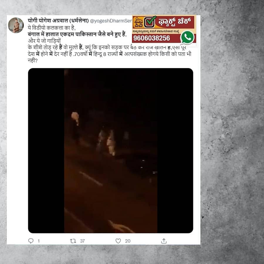 ದುಷ್ಕರ್ಮಿಗಳ ಗುಂಪೊಂದು ರಸ್ತೆಯಲ್ಲಿ ಸಾಗುವ ವಾಹನಗಳ ಮೇಲೆ ಕಲ್ಲು ತೂರಾಟ ನಡೆಸುತ್ತಿರುವ ವಿಡಿಯೊ ವೈರಲ್ ಆಗಿದೆ. ‘ಈ ಘಟನೆಯು ಕೋಲ್ಕತ್ತದಲ್ಲಿ ನಡೆದಿದೆ. ಪಶ್ಚಿಮ ಬಂಗಾಳದ ಪರಿಸ್ಥಿತಿಯು ಪಾಕಿಸ್ತಾನದಂತೆ ಆಗಿದೆ.ಮುಸ್ಲಿಮರ ಗುಂಪೊಂದು ವಾಹನಗಳಿಗೆ ಕಲ್ಲು ಹೊಡೆದು ಹಿಂಸಾಚಾರ ನಡೆಸುತ್ತಿದೆ. ರಸ್ತೆಯಲ್ಲಿ ಕುಳಿತು ತಮ್ಮ ಉಪವಾಸ ಮುರಿಯುವ ಸಲುವಾಗಿ ಅವರು ಈ ರೀತಿ ನಡೆದುಕೊಂಡಿದ್ದಾರೆ. ಸದ್ಯದಲ್ಲೇ ಈ ರೀತಿಯ ಘಟನೆಗಳು ದೇಶದಾದ್ಯಂತ ನಡೆಯುತ್ತವೆ’ ಎಂದು ಅಡಿಬರಹ ನೀಡಲಾಗಿದೆ.