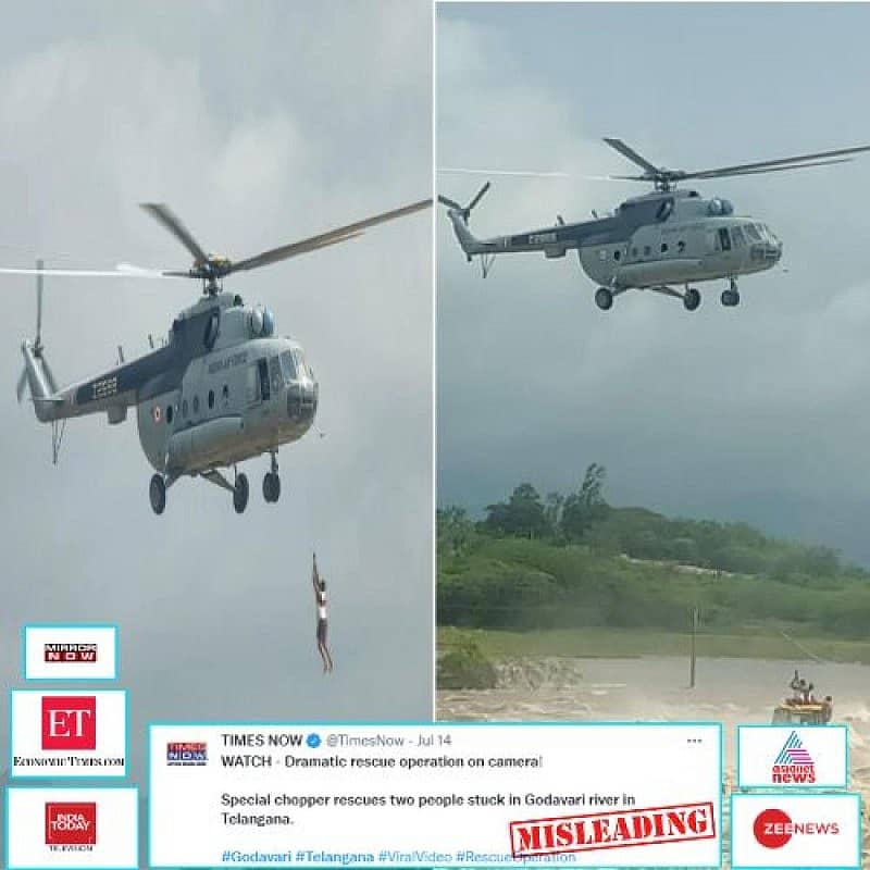 ಗೋದಾವರಿನದಿಯಿಂದಉಂಟಾದ ಪ್ರವಾಹದಲ್ಲಿ ಸಿಲುಕಿದ್ದ ಜನರನ್ನು ರಕ್ಷಿಸಲಾಯಿತು ಎಂಬುದನ್ನು ಬಿಂಬಿಸುವ ವಿಡಿಯೊವೊಂದು ಇತ್ತೀಚೆಗೆ ಕೆಲವು ಸುದ್ದಿವಾಹಿನಿಗಳಲ್ಲಿ ಪ್ರಸಾರವಾಯಿತು. ಪ್ರವಾಹದಲ್ಲಿ ಸಿಲುಕಿದ್ದಅರ್ತ್ಮೂವರ್ ಯಂತ್ರದ ಮೇಲೆ ಕೆಲ ಜನರು ರಕ್ಷಣೆ ಪಡೆದಿದ್ದರು. ಸಂತ್ರಸ್ತರ ನೆರವಿಗೆ ಧಾವಿಸಿದ ವಾಯುಪಡೆಯ ಎರಡು ವಿಶೇಷ ಹೆಲಿಕಾಪ್ಟರ್ಗಳು ಹಗ್ಗದ ಮೂಲಕ ಜನರನ್ನು ರಕ್ಷಿಸಿದ ರೋಚಕ ವಿಡಿಯೊ ಸಾಕಷ್ಟು ವೈರಲ್ ಆಗಿತ್ತು.ಇದು ತೆಲಂಗಾಣದಲ್ಲಿ ಉಂಟಾದ ಪ್ರವಾಹದ ವಿಡಿಯೊ ಎಂಬುದಾಗಿ ಸಾಮಾಜಿಕ ಜಾಲತಾಣಗಳಲ್ಲಿ ಚರ್ಚೆಯಾಯಿತು.