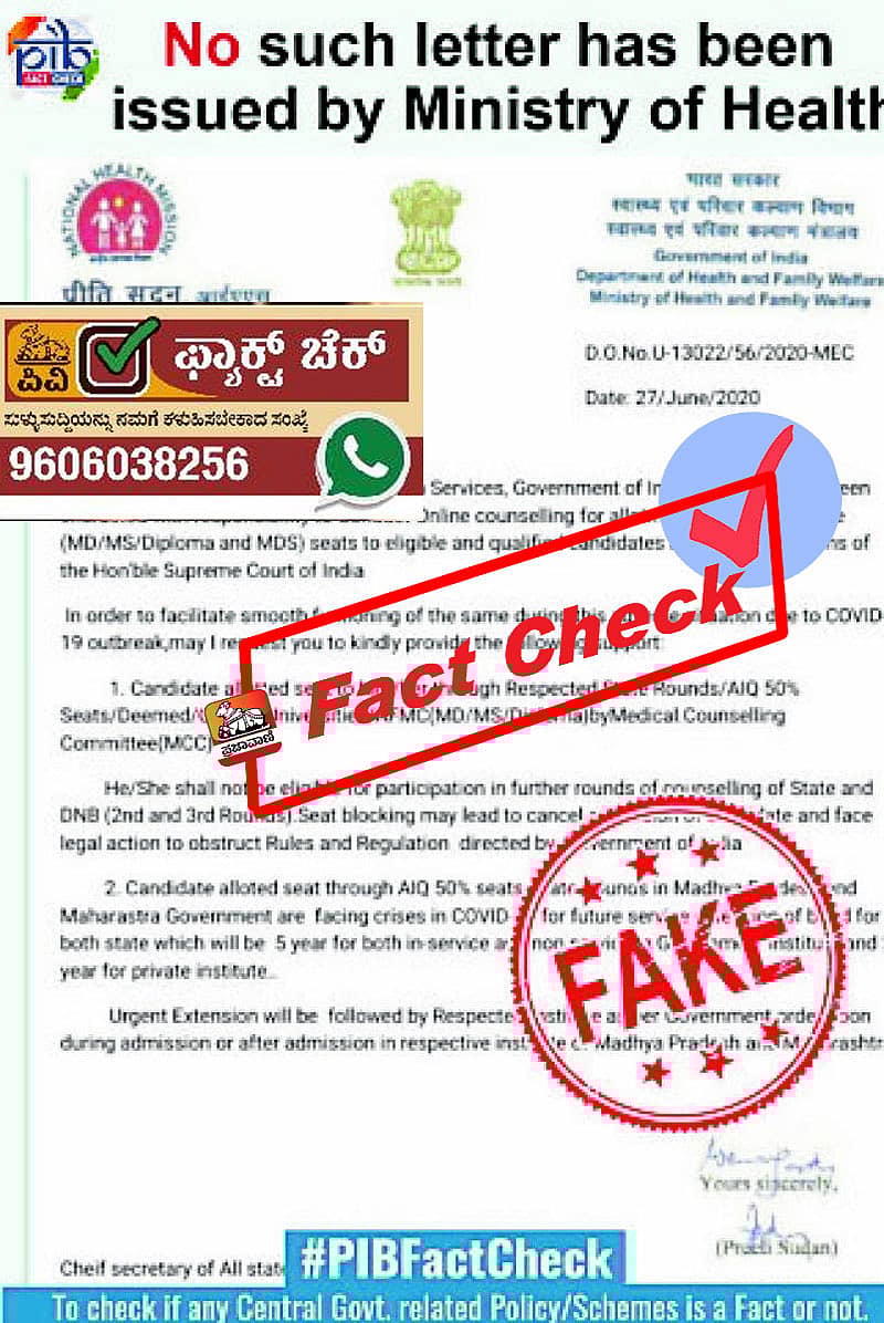 ಆದರೆ,ಆನ್ಲೈನ್ ಕೌನ್ಸೆಲಿಂಗ್ ಅಥವಾ ಪಿ.ಜಿ ಸೀಟು ಹಂಚಿಕೆ ಕುರಿತು ಮಾಹಿತಿ ನೀಡುವ ಸುತ್ತೋಲೆಯೇ ನಕಲಿ ಎಂದು ಪಿಐಬಿ ಫ್ಯಾಕ್ಟ್ ಚೆಕ್ ತಂಡ ಹೇಳಿದೆ. ಆರೋಗ್ಯ ಸಚಿವಾಲಯ ಅಂತಹ ಪತ್ರವನ್ನು ಬರೆದಿಲ್ಲ ಎಂದು ಸ್ಪಷ್ಟನೆ ನೀಡಿದೆ.