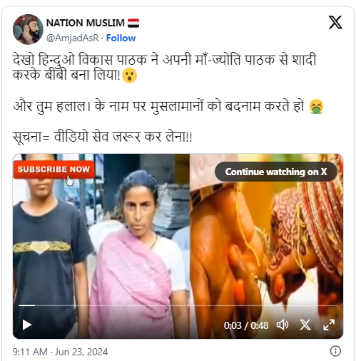 ವಿಕಾಸ್ ಪಾಠಕ್ ಎನ್ನುವ ವ್ಯಕ್ತಿ, ಮೂರು ವರ್ಷದ ಹಿಂದೆ ತನ್ನ ತಂದೆ ಅಪಘಾತವೊಂದರಲ್ಲಿ ಸಾವಿಗೀಡಾದ ನಂತರ ತಾಯಿ ಜ್ಯೋತಿ ಪಾಠಕ್ ಅವರನ್ನು ಮದುವೆಯಾಗಿದ್ದಾರೆ ಎಂದು ಪ್ರತಿಪಾದಿಸುವ ವಿಡಿಯೊ ಒಂದು ಸಾಮಾಜಿಕ ಜಾಲತಾಣದಲ್ಲಿ ಹರಿದಾಡುತ್ತಿದೆ. ಕೆಲವರು ಅದನ್ನು ಧರ್ಮದ ಆಧಾರದಲ್ಲಿ ಟೀಕಿಸುತ್ತಿದ್ದು, ವ್ಯಾಪಕವಾಗಿ ಹಂಚಿಕೊಳ್ಳುತ್ತಿದ್ದಾರೆ. ಲಕ್ಷಾಂತರ ಮಂದಿ ಈ ವಿಡಿಯೊ ವೀಕ್ಷಿಸಿದ್ದು, ಸಾವಿರಾರು ಮಂದಿ ರೀಟ್ವೀಟ್ ಮಾಡಿದ್ದಾರೆ.