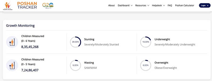 ಪೋಷಣ್ ಟ್ರ್ಯಾಕರ್ನಲ್ಲಿ 7.24 ಕೋಟಿ ಮಕ್ಕಳ ಪೌಷ್ಟಿಕಾಂಶದ ಸ್ಥಿತಿಯನ್ನಷ್ಟೇ ಅಪ್ಲೋಡ್ ಮಾಡಲಾಗಿದೆ. ಈ 7.24 ಕೋಟಿ ಮಕ್ಕಳಲ್ಲಿ ಶೇ 7.2ರಷ್ಟು ಮಕ್ಕಳು ಎತ್ತರಕ್ಕೆ ತಕ್ಕ ತೂಕವಿಲ್ಲದೇ ಇರುವ ಸಮಸ್ಯೆಯಿಂದ ಬಳಲುತ್ತಿದ್ದಾರೆ ಎಂದು ಪೋಷಣ್ ಟ್ರ್ಯಾಕರ್ ಹೇಳುತ್ತದೆ. ಜತೆಗೆ ಇತ್ತೀಚಿನ ಜನಗಣತಿ ನಡೆಯದೇ ಇರುವ ಕಾರಣ, ಈ ವಯಸ್ಸಿನ ಮಕ್ಕಳ ನೈಜ ಸಂಖ್ಯೆ ಎಷ್ಟು ಎಂಬ ಮಾಹಿತಿ ಲಭ್ಯವಿಲ್ಲ. ವಿಶ್ವ ಸಂಸ್ಥೆಯ ಅಂದಾಜಿ ಪ್ರಕಾರ ಭಾರತದಲ್ಲಿ ಈ ವಯಸ್ಸಿನ ಮಕ್ಕಳ ಸಂಖ್ಯೆ 11.3 ಕೋಟಿಯಷ್ಟು. ಹೀಗಾಗಿ ಪೋಷಣ್ ಟ್ರ್ಯಾಕರ್ನಲ್ಲಿನ ದತ್ತಾಂಶಗಳು ಭಾರತದಲ್ಲಿರುವ ಐದು ವರ್ಷಕ್ಕಿಂತ ಕಡಿಮೆ ವಯಸ್ಸಿನ ಎಲ್ಲಾ ಮಕ್ಕಳಿಗೆ ಅನ್ವಯವಾಗುವುದಿಲ್ಲ. ಅಲ್ಲದೆ, ಎನ್ಎಫ್ಎಚ್ಎಸ್–5 ದತ್ತಾಂಶ ಪ್ರಕಾರ ಭಾರತದಲ್ಲಿ ಎತ್ತರಕ್ಕೆ ತಕ್ಕ ತೂಕವಿಲ್ಲದೇ ಇರುವ ಮಕ್ಕಳ ಪ್ರಮಾಣ ಶೇ 19.3ರಷ್ಟು.
