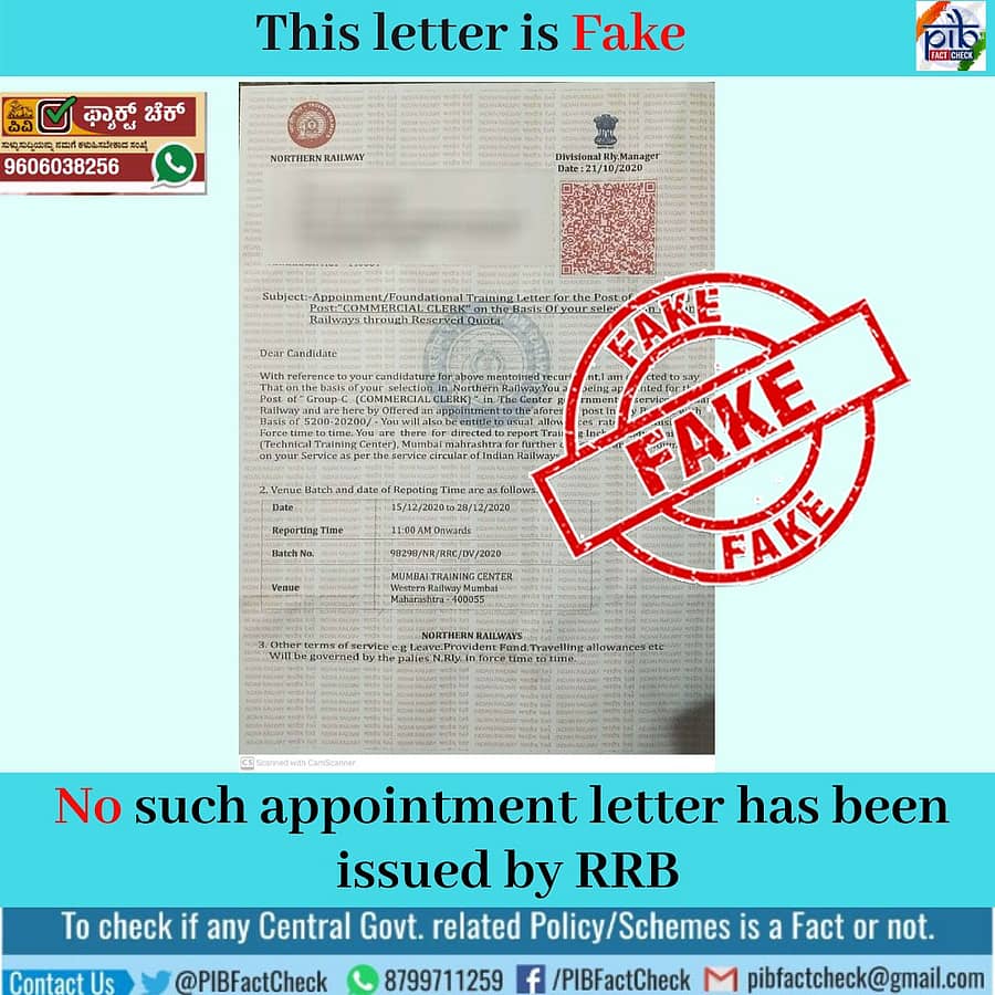 ರೈಲ್ವೆ ಇಲಾಖೆ ಉದ್ಯೋಗಕ್ಕೆ ಆಹ್ವಾನ ನೀಡಿದೆ ಎನ್ನಲಾದ ಪತ್ರದ ಸತ್ಯಾಸತ್ಯಾತೆಯನ್ನು ಪಿಐಬಿ ಫ್ಯಾಕ್ಟ್ ಚೆಕ್ ಪರಿಶೀಲನೆ ನಡೆಸಿದೆ. ಇಲಾಖೆಯನ್ನು ಸಂಪರ್ಕಿಸಿದಾಗ, ಇಂತಹ ಪ್ರಕಟಣೆಯನ್ನು ನೀಡಿಲ್ಲ ಎಂಬ ಉತ್ತರ ಸಿಕ್ಕಿದೆ. ಇದೊಂದು ದಾರಿ ತಪ್ಪಿಸುವ ಯತ್ನವಾಗಿದ್ದು, ನಿರುದ್ಯೋಗಿಗಳು ಎಚ್ಚರದಿಂದ ಇರಬೇಕು ಎಂದು ಸಲಹೆ ನೀಡಿದೆ.