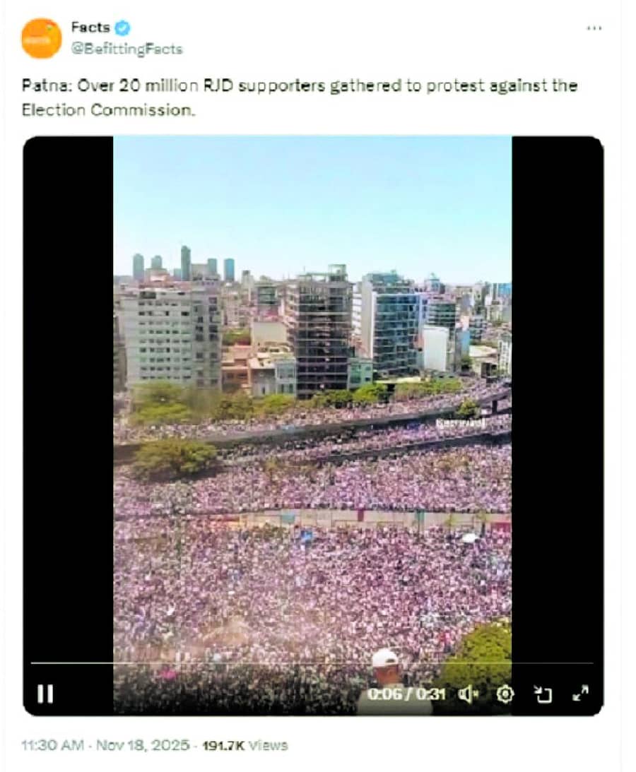 ಬಿಹಾರದ ಚುನಾವಣೆಯಲ್ಲಿ ಸೋತಿರುವ ರಾಷ್ಟ್ರೀಯ ಜನತಾ ದಳದ (ಆರ್ಜೆಡಿ) ಬೆಂಬಲಿಗರು ಮಂಗಳವಾರ (ನ.18) ಪಟ್ನಾದಲ್ಲಿ ಚುನಾವಣಾ ಆಯೋಗದ ವಿರುದ್ಧ ಪ್ರತಿಭಟನೆ ನಡೆಸಿದ್ದು, ಇದರಲ್ಲಿ 2 ಕೋಟಿಗೂ ಹೆಚ್ಚು ಜನರು ಭಾಗವಹಿಸಿದ್ದಾರೆ ಎಂದು ಪ್ರತಿಪಾದಿಸುತ್ತಾ ನಗರವೊಂದರ ರಸ್ತೆಗಳಲ್ಲಿ ಭಾರಿ ಜನಸ್ತೋಮ ಇರುವ ವಿಡಿಯೊ ತುಣುಕೊಂದನ್ನು ಸಾಮಾಜಿಕ ಜಾಲತಾಣಗಳಲ್ಲಿ ಹಂಚಲಾಗುತ್ತಿದೆ.