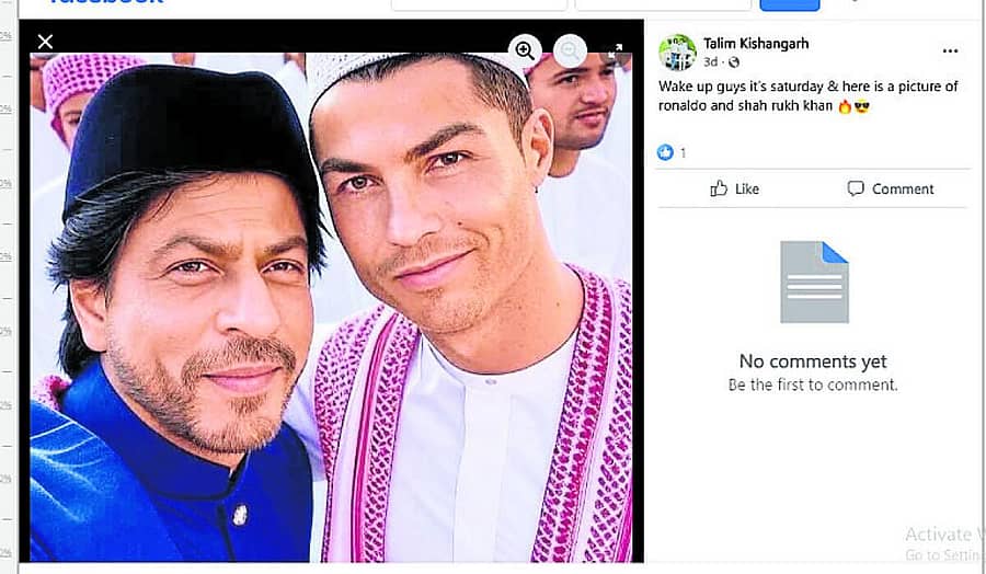 ಬಾಲಿವುಡ್ ನಟ ಶಾರುಕ್ ಖಾನ್ ಅವರು ಮೆಕ್ಕಾದಲ್ಲಿನ ಹರಮ್ ಶರೀಫ್ನಲ್ಲಿ ಫುಟ್ಬಾಲ್ ದಂತಕಥೆ ಕ್ರಿಶ್ಚಿಯಾನೊ ರೊನಾಲ್ಡೊ ಅವರ ಜತೆಗಿರುವ ಚಿತ್ರವೊಂದು ಸಾಮಾಜಿಕ ಜಾಲತಾಣಗಳಲ್ಲಿ ಹರಿದಾಡುತ್ತಿದೆ. ಕೆಲವರು, ‘ಎದ್ದೇಳಿ ಜನಗಳೇ, ಇದು ಶನಿವಾರ. ಇಲ್ಲಿ ನೋಡಿ ಶಾರುಕ್ ಖಾನ್ ಮತ್ತು ಕ್ರಿಶ್ಚಿಯಾನೊ ರೊನಾಲ್ಡೊ ಅವರು ಜತೆಗಿರುವ ಚಿತ್ರ’ ಎಂದು ಪ್ರತಿಪಾದಿಸುತ್ತಾ, ಚಿತ್ರವನ್ನು ಹಂಚಿಕೊಳ್ಳುತ್ತಿದ್ದಾರೆ. ಆದರೆ, ಇದು ಅಸಲಿ ಚಿತ್ರ ಅಲ್ಲ.