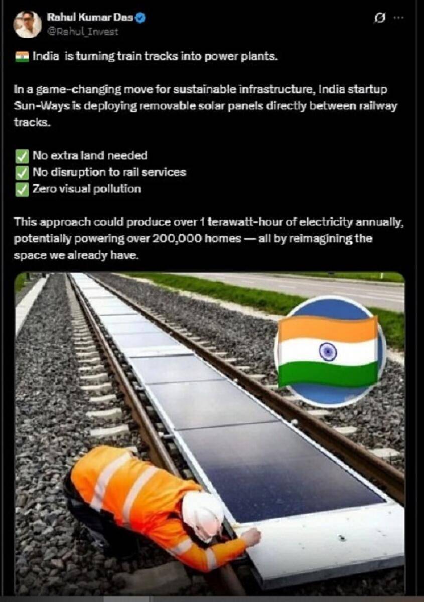 ರೈಲು ಹಳಿಗಳ ನಡುವೆ ಸೌರ ಫಲಕಗಳನ್ನು ಅಳವಡಿಸಿ ವಿದ್ಯುತ್ ಉತ್ಪಾದಿಸಲು ಭಾರತೀಯ ರೈಲ್ವೆ ಮುಂದಾಗಿದೆ. ಭಾರತದ ನವೋದ್ಯಮ ‘ಸನ್ –ವೇಸ್’ ಕಳಚಬಹುದಾದಂತಹ ಸೌರಫಲಕಗಳನ್ನು ಅಳವಡಿಸಲಿದೆ. ಇದರಿಂದಾಗಿ ವಾರ್ಷಿಕವಾಗಿ ಒಂದು ಟೆರಾ ವ್ಯಾಟ್ನಷ್ಟು ವಿದ್ಯುತ್ ಉತ್ಪಾದನೆಯಾಗಲಿದೆ ಎಂದು ಹೇಳಿಕೊಳ್ಳುವ ಪೋಸ್ಟ್ ಒಂದು ಇತ್ತೀಚೆಗೆ ಸಾಮಾಜಿಕ ಜಾಲತಾಣಗಳಲ್ಲಿ ಹರಿದಾಡುತ್ತಿದೆ. ಆದರೆ, ಇದು ಸುಳ್ಳು.