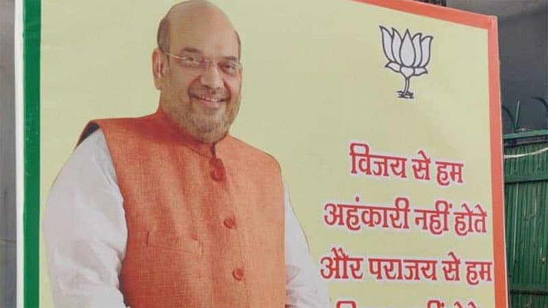 ಅಮಿತ್ ಶಾ ಅವರ ಭಾವಚಿತ್ರವೂ ಈ ಬ್ಯಾನರ್ನಲ್ಲಿ ಸೋಲು ಮತ್ತು ಗೆಲುವುಗಳ ಕುರಿತು ಹೀಗೆ ಬರೆಯಲಾಗಿದೆ... ‘ವಿಜಯ ನಮ್ಮನ್ನು ಅಹಂಕಾರಿಗಳನ್ನಾಗಿ ಮಾಡುವುದಿಲ್ಲ. ಸೋಲು ನಮ್ಮನ್ನು ನಿರಾಶವಾದಿಗಳನ್ನಾಗಿ ಮಾಡುವುದಿಲ್ಲ,’ ಎಂಬ ಸಂದೇಶವನ್ನು ಹಿಂದಿಯಲ್ಲಿ ಉಲ್ಲೇಖಿಸಲಾಗಿದೆ.