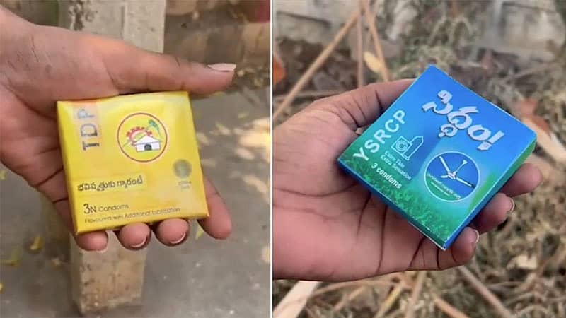 ಇದರ ಬೆನ್ನಲ್ಲೇ, ವ್ಯಕ್ತಿಯೊಬ್ಬರು ವೈಎಸ್ಆರ್ಸಿಪಿ ಹೆಸರು ಮತ್ತು ಲೋಗೊ ಇರುವ ಕಾಂಡೋಮ್ ಪ್ಯಾಕೆಟ್ ಹಿಡಿದಿರುವ ವಿಡಿಯೊ ಸಹ ಹರಿದಾಡುತ್ತಿದೆ. ಇದಕ್ಕೆ ಪ್ರತಿಕ್ರಿಯಿಸಿರುವ ಟಿಡಿಪಿ, 'ಕೀಳು ಮಟ್ಟದ ಪ್ರಚಾರ' ಎಂದು ಕಿಡಿಕಾರಿದೆ.