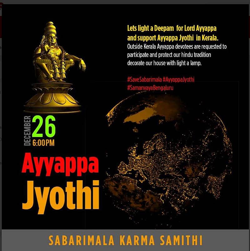 ಶಬರಿಮಲೆಗೆ ಮಹಿಳೆಯರನ್ನು ಪ್ರವೇಶಿಸುವ ಸರ್ಕಾರದ ನಿಲುವಿನ ವಿರುದ್ಧ ಶಬರಿಮಲೆ ಕರ್ಮ ಸಮಿತಿ ಪ್ರತಿಭಟನೆ ನಡೆಸುತ್ತಾ ಬಂದಿದೆ. ನವೋತ್ಥಾನ ಮೌಲ್ಯಗಳ ರಕ್ಷಣೆಗಾಗಿ ಸರ್ಕಾರ ವನಿತಾ ಮದಿಲ್ ಕಾರ್ಯಕ್ರಮ ಆಯೋಜಿಸುವುದಾಗಿ ಘೋಷಿಸಿದ ಬೆನ್ನಲೇ ಅಯ್ಯಪ್ಪ ಜ್ಯೋತಿ ಬೆಳಗಿಸುವುದಾಗಿ ಕರ್ಮ ಸಮಿತಿ ಘೋಷಿಸಿತ್ತು. ಈ ಕಾರ್ಯಕ್ರಮಕ್ಕೆ ಬಿಜೆಪಿ ಬೆಂಬಲ ಸೂಚಿಸಿತ್ತು.