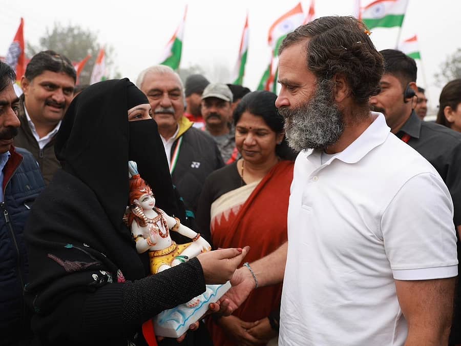 ಬುರ್ಖಾಧಾರಿ ಮುಸ್ಲಿಂ ಮಹಿಳೆಯೊಬ್ಬರು, ಶಿವನ ವಿಗ್ರಹವನ್ನು ರಾಹುಲ್ ಗಾಂಧಿಗೆ ನೀಡಿದರು. ಈ ಫೋಟೋವನ್ನು ಕಾಂಗ್ರೆಸ್ ತನ್ನ ಸಾಮಾಜಿಕ ಜಾಲತಾಣದಲ್ಲಿ ಹಂಚಿಕೊಂಡಿದ್ದು, ‘ಈಶ್ವರ್ ಅಲ್ಲಾ ತೇರೋ ನಾಮ್‘ ಎಂದು ಬರೆದುಕೊಂಡಿದೆ.