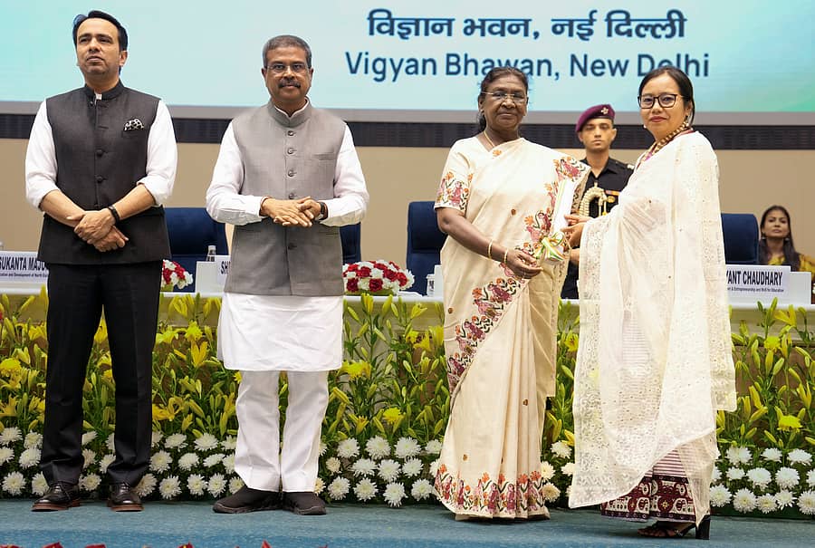 ನವದೆಹಲಿಯ ವಿಜ್ಞಾನ ಭವನದಲ್ಲಿ ಶುಕ್ರವಾರ ನಡೆದ ‘ರಾಷ್ಟ್ರೀಯ ಶಿಕ್ಷಕರ ಪುರಸ್ಕಾರ–2025’ ಸಮಾರಂಭದಲ್ಲಿ ಮುರ್ಮು ಅವರು ಶಿಕ್ಷಣ ಕ್ಷೇತ್ರದಲ್ಲಿ ಅಪಾರ ಸೇವೆ ಸಲ್ಲಿಸಿದವರಿಗೆ ಪ್ರಶಸ್ತಿ ಪ್ರದಾನ ಮಾಡಿದರು