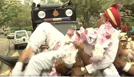 ಪ್ರತಿಭಟನೆ ವೇಳೆ ವರನ ವೇಷ ಧರಿಸಿದ್ದ ಕಾಂಗ್ರೆಸ್ ಕಾರ್ಯಕರ್ತರೊಬ್ಬರು ತಲೆ ಮೇಲೆ ಪೇಟ, ಎರಡು ಸಾವಿರ ಮುಖಬೆಲೆಯ ನಕಲಿ ನೋಟುಗಳ ಹಾರವನ್ನು ಕುತ್ತಿಗೆಗೆ ಹಾಕಿಕೊಂಡು ಎಲ್ಲರ ಗಮನ ಸೆಳೆದ್ದಾರೆ. ಈ ವಿಡಿಯೊ ಸಾಮಾಜಿಕ ಜಾಲತಾಣಗಳಲ್ಲಿ ಹರಿದಾಡುತ್ತಿದೆ.