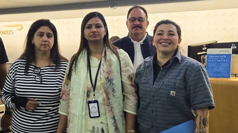 ಅಮೆರಿಕದಿಂದ ಹಸ್ತಾಂತರಗೊಂಡ ಮೋನಿಕಾ ಕಪೂರ್ (ಎಡದಿಂದ ಮೊದಲನೆಯವರು) ಅವರನ್ನು ಭಾರತಕ್ಕೆ ಕರೆತರುವ ಮೊದಲು ಸಿಬಿಐ ತಂಡ