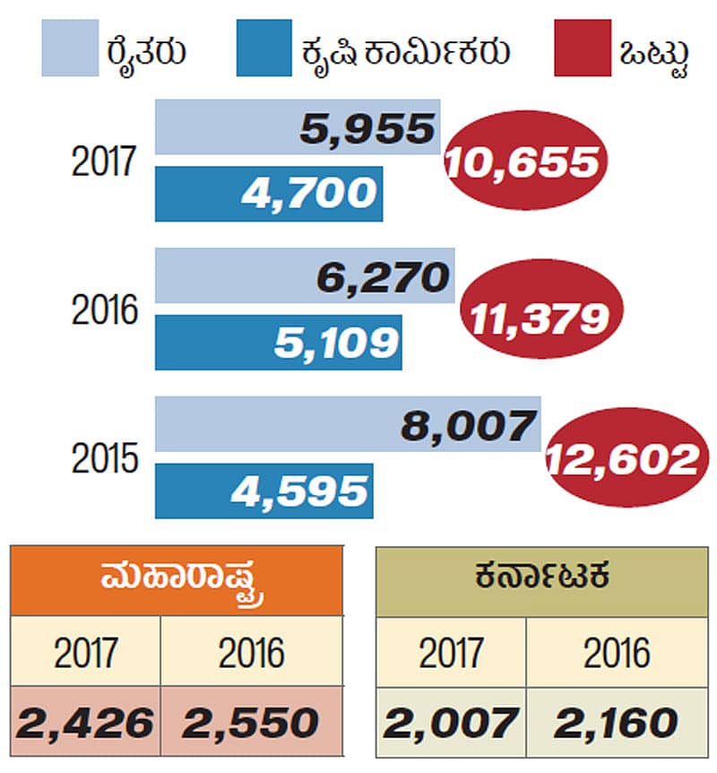 ಕರ್ನಾಟಕ ಮತ್ತು ಮಹಾರಾಷ್ಟ್ರದಲ್ಲಿ 2017 ರಲ್ಲಿ ರೈತರ ಆತ್ಮಹತ್ಯೆ ಪ್ರಮಾಣ ಈ ಹಿಂದಿನ ವರ್ಷಗಳಿಗೆ ಹೋಲಿಸಿದರೆ ಹೆಚ್ಚಿದೆ.
