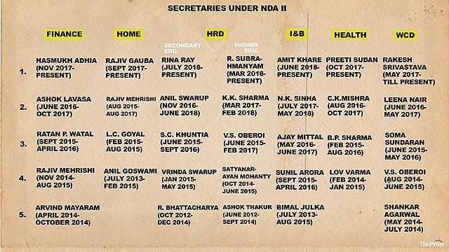 ಒಂದು ಸಚಿವಾಲಯದಲ್ಲಿ ಎರಡು ವರ್ಷಗಳ ನಿಶ್ಚಿತ ಸೇವಾವಧಿ ಇದ್ದ ಹೊರತಾಗಿಯೂ ಮೋದಿ ಆಡಳಿತಾವಧಿಯಲ್ಲಿ ಹಣಕಾಸು ಇಲಾಖೆ ಐವರು ಕಾರ್ಯದರ್ಶಿಗಳನ್ನು ಕಂಡಿದೆ! ಗೃಹ ಇಲಾಖೆಯಲ್ಲಿ ನಾಲ್ಕು ವರ್ಷಗಳಲ್ಲಿ ನಾಲ್ವರು ಕಾರ್ಯದರ್ಶಿಗಳು ಕಾರ್ಯನಿರ್ವಹಿಸಿದ್ದಾರೆ.
