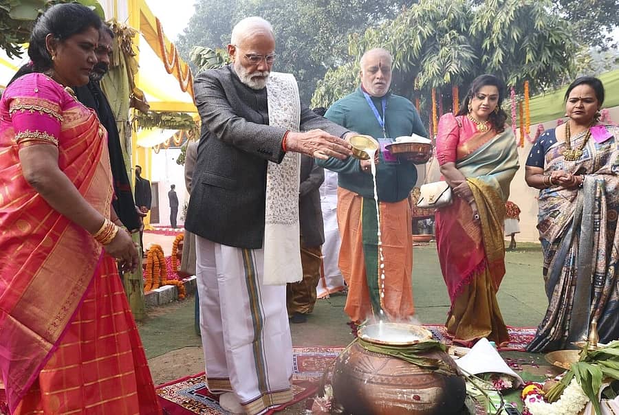 ಪೊಂಗಲ್ ಹಬ್ಬದ ಪ್ರಯುಕ್ತ ಆಯೋಜಿಸಲಾದ ಕಾರ್ಯಕ್ರಮದಲ್ಲಿ ಪೂಜೆ ಸಲ್ಲಿಸುತ್ತಿರುವ ಪ್ರಧಾನಮಂತ್ರಿ ನರೇಂದ್ರ ಮೋದಿ.