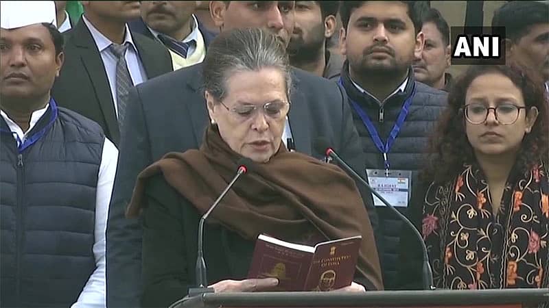 ಸೋನಿಯಾ ಗಾಂಧಿ, ಮನಮೋಹನ್ ಸಿಂಗ್ ಮತ್ತು ರಾಹುಲ್ ಗಾಂಧಿ ಅವರು ಸತ್ಯಾಗ್ರಹದಲ್ಲಿ ಸಂವಿಧಾನದ ಮುನ್ನುಡಿ ಓದಿದರು.