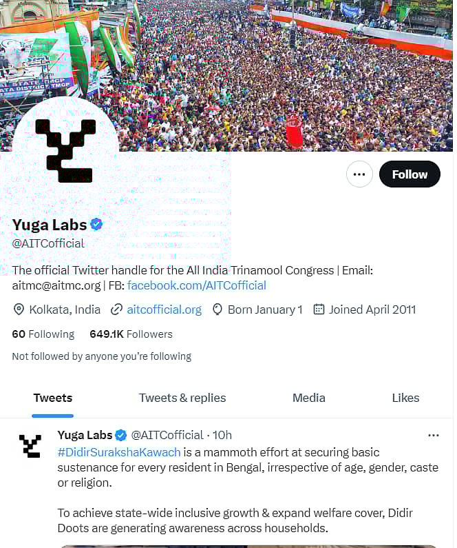 ನವದೆಹಲಿ: ಅಖಿಲ ಭಾರತ ತೃಣಮೂಲ ಕಾಂಗ್ರೆಸ್ ಪಕ್ಷದ ಟ್ವಿಟರ್ ಖಾತೆಯನ್ನು ಹ್ಯಾಕ್ ಮಾಡಲಾಗಿದ್ದು, ‘Yuga Labs’ ಎಂದು ಹೆಸರು ಬದಲಿಸಲಾಗಿದೆ.