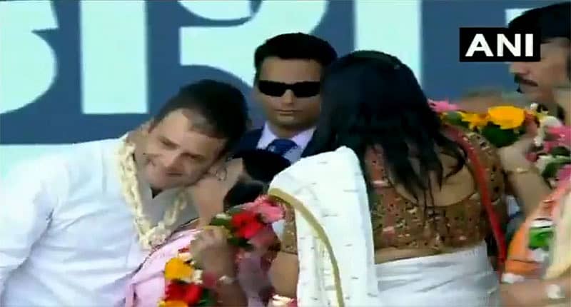 ಗುಜರಾತ್ನ ವಲ್ಸಾದ್ನಲ್ಲಿ ಗುರುವಾರ ಆಯೋಜಿಸಿದ್ದ ರ್ಯಾಲಿ ವೇಳೆ ಕಾರ್ಯಕ್ರಮವೇದಿಕೆ ಮೇಲೆ ಹಾರ ಹಿಡಿದು ಬಂದ ಅಭಿಮಾನಿ ಮಹಿಳೆಯರ ಗುಂಪಿನಲ್ಲಿದ್ದ ಒಬ್ಬ ಮಹಿಳೆ ರಾಹುಲ್ ಕೆನ್ನೆಗೆ ಮುತ್ತಿಕ್ಕಿದರು. ಬಳಿಕ ಗುಂಪು ರಾಹುಲ್ಗೆ ಹೂ ಮಾಲೆ ಹಾಕಿ ಅಭಿನಂದಿಸಿತು.