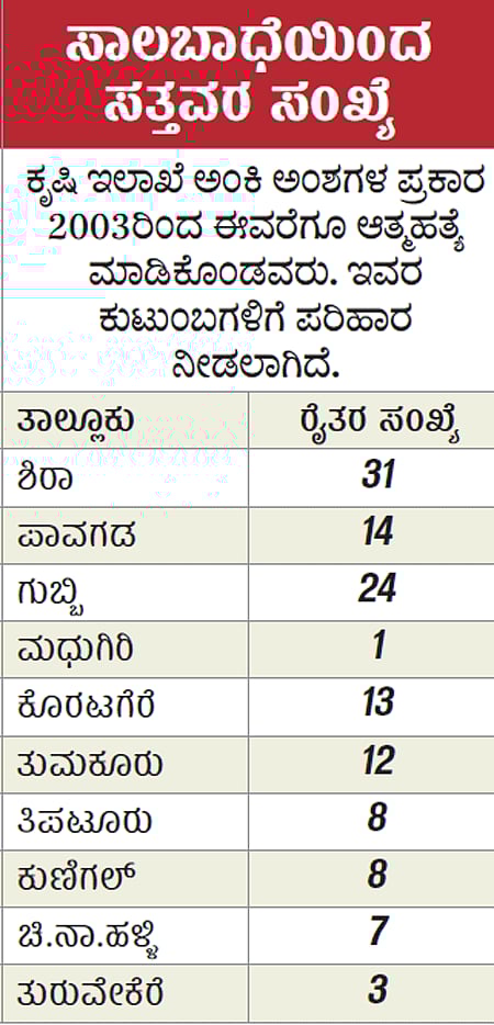 ಶೇಂಗಾ ಬೆಳೆಯುವ ಪ್ರದೇಶಗಳಲ್ಲೇ ಅತಿ ಹೆಚ್ಚು ಆತ್ಮಹತ್ಯೆ ಕಂಡುಬರುತ್ತದೆ. ಜಿಲ್ಲೆಯಲ್ಲಿ ಈವರೆಗೆ ಆಗಿರುವ ಆತ್ಮಹತ್ಯೆಗಳಲ್ಲಿ ಶಿರಾ ತಾಲ್ಲೂಕು ಅಗ್ರಸ್ಥಾನದಲ್ಲಿದೆ. ಹೇಮಾವತಿ, ಭದ್ರಾ ಮೇಲ್ದಂಡೆ, ಎತ್ತಿನಹೊಳೆ ಯೋಜನೆಗಳ ಮೂಲಕ ನೀರು ಹರಿಸುವ ಹೋರಾಟ, ಮಾತುಗಳು ಎರಡು ದಶಕಗಳಿಂದಲೂ ಕೇಳಿಬರುತ್ತಿವೆ. ಆದರೆ ನೀರು ಮಾತ್ರ ಬಂದಿಲ್ಲ. ಶಾಶ್ವತ ನೀರಾವರಿ ಯೋಜನೆ ಸಾಕಾರವಾದರೆ ಮಾತ್ರ ರೈತರ ಜೀವ ಕಾಪಾಡಬಹುದಾಗಿದೆ.