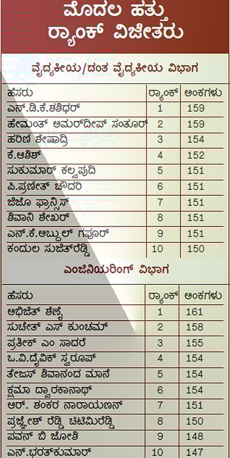 ವೈದ್ಯಕೀಯ ವಿಭಾಗದಲ್ಲಿ ಕೇರಳದ ಎನ್.ಡಿ.ಕೆ.ಶಶಿಧರ್ ಮೊದಲ ರ್ಯಾಂಕ್ ಪಡೆದಿದ್ದರೆ, ಬೆಂಗಳೂರಿನ ಹೇಮಂತ್ ಅಮರ್ದೀಪ್ ಸಂತೂರ್ ಎರಡನೇ ರ್ಯಾಂಕ್ ಹಾಗೂ ಹರಿಣಿ ಶೇಷಾದ್ರಿ ಮೂರನೇ ರ್ಯಾಂಕ್ ಪಡೆದಿದ್ದಾರೆ.