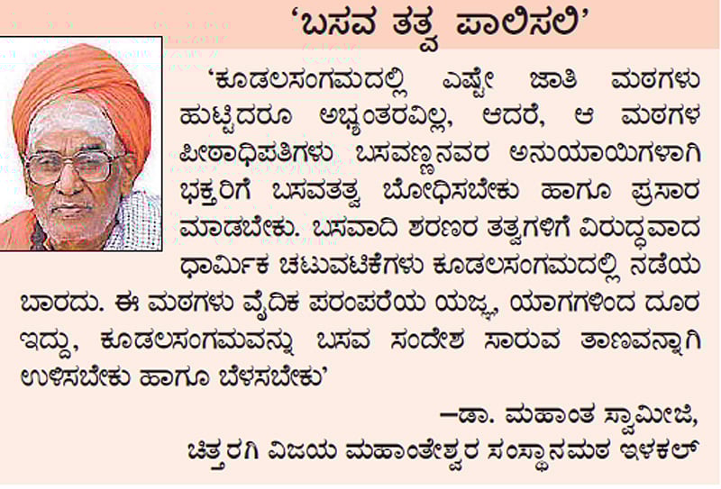 ‘2003 ಮೇ 27ರಂದು ಬಸವತತ್ವದಡಿ ನಾಡಿನ ಎಲ್ಲ ಮಠಾಧೀಶರನ್ನು ಒಗ್ಗೂಡಿಸುವ ಸಂಬಂಧ ಕೂಡಲಸಂಗಮದಲ್ಲಿ ವಿಶ್ವಧರ್ಮಗಳ ಸಮ್ಮೇಳನ ನಡೆಯಿತು. ರಾಜ್ಯದ ಎರಡು ಸಾವಿರಕ್ಕೂ ಅಧಿಕ ಮಠಾಧೀಶರು ಸಮಾವೇಶದಲ್ಲಿ ಪಾಲ್ಗೊಂಡಿದ್ದರು. ಈ ಸಮಾವೇಶದ ಬಳಿಕ ಮಠಾಧೀಶರು ಇದೇ ಜಾಗದಲ್ಲಿ ತಮ್ಮ ತಮ್ಮ ಜಾತಿ ಸಮಾವೇಶಗಳನ್ನು ಆಯೋಜಿಸಿ ಲಕ್ಷಾಂತರ ಜನರನ್ನು ಸೇರಿಸಿದರು. ಹೀಗೆ ಕೂಡಲಸಂಗಮ ಎಂಬುದು ಜಾತಿಗಳ ಸಂಘಟನೆಗೆ ಪ್ರಧಾನ ಭೂಮಿಕೆಯಾಗಿ ಮಾರ್ಪಟ್ಟಿತು’ ಎಂದು ಹೇಳಿದರು.