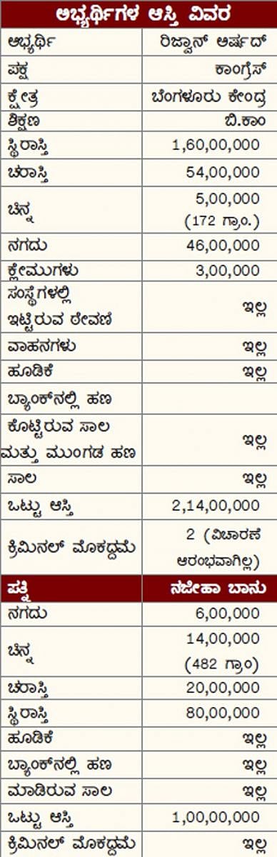 ಲೋಕಸಭಾ ಚುನಾವಣೆಗೆ ಗುರುವಾರ ಸಲ್ಲಿಸಿರುವ ನಾಮಪತ್ರದ ಜೊತೆಗೆ ನೀಡಿರುವ ಪ್ರಮಾಣ ಪತ್ರದಲ್ಲಿ ರಿಜ್ವಾನ್ ಈ ಮಾಹಿತಿ ಒದಗಿಸಿದ್ದಾರೆ. ಅವರಾಗಲೀ, ಪತ್ನಿ ನಜೀಹಾ ಬಾನು ಅವರಾಗಲೀ ಯಾರಿಂದಲೂ ಸಾಲ ಪಡೆದಿಲ್ಲ, ಯಾರಿಗೂ ಸಾಲ ಕೊಟ್ಟಿಲ್ಲ ಎಂಬ ಮಾಹಿತಿಯೂ ಪ್ರಮಾಣ ಪತ್ರದಲ್ಲಿದೆ.