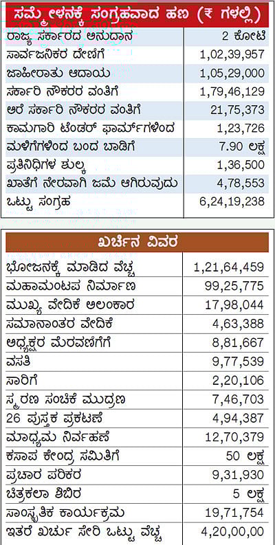 ಸಾಹಿತ್ಯ ಸಮ್ಮೇಳನ ನಡೆದು ಒಂದು ವರ್ಷವಾದರೂ ವೆಚ್ಚದ ಅಧಿಕೃತ ಮಾಹಿತಿ ಇನ್ನೂ ಸರ್ಕಾರಕ್ಕೆ ಸಲ್ಲಿಕೆಯಾಗಿಲ್ಲ. ‘ಪ್ರಜಾವಾಣಿ’ ಒಂದು ವಾರ ಕಾಲ ನಡೆಸಿದ ಅವಿರತ ಪ್ರಯತ್ನದ ಫಲವಾಗಿ ಸಮ್ಮೇಳನದ ಹಣ ಸ್ವೀಕೃತಿ ಮತ್ತು ವೆಚ್ಚದ ಬಗೆಗಿನ ನಿಖರ ಅಂಕಿ ಅಂಶಗಳು ಲಭ್ಯವಾಗಿವೆ.