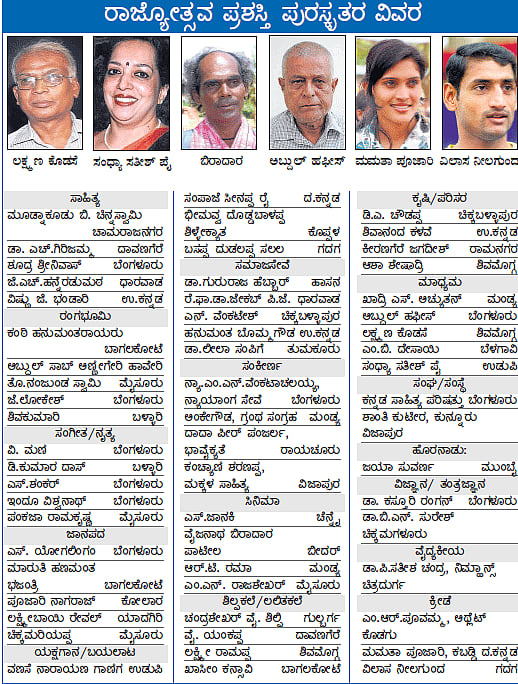 ಮೂಡ್ನಾಕೂಡು ಬಿ.ಚಿನ್ನಸ್ವಾಮಿ, ಶೂದ್ರ ಶ್ರೀನಿವಾಸ್ ಸೇರಿದಂತೆ ಸಾಹಿತ್ಯ ಕ್ಷೇತ್ರದ ಐವರು ಹಾಗೂ ‘ಪ್ರಜಾವಾಣಿ’ ನಿವೃತ್ತ ಸಹಾಯಕ ಸಂಪಾದಕ ಲಕ್ಷ್ಮಣ ಕೊಡಸೆ ಸೇರಿದಂತೆ ಐವರು ಪತ್ರಕರ್ತರನ್ನು ಪ್ರಶಸ್ತಿಗೆ ಆಯ್ಕೆ ಮಾಡಲಾಗಿದೆ. ಮುಖ್ಯಮಂತ್ರಿ ಸಿದ್ದರಾಮಯ್ಯ ಅಧ್ಯಕ್ಷತೆಯ ಉನ್ನತ ಮಟ್ಟದ ಸಮಿತಿ ಪ್ರಶಸ್ತಿ ಪುರಸ್ಕೃತರನ್ನು ಆಯ್ಕೆ ಮಾಡಿದೆ. ಗುರುವಾರ ಸಂಜೆ ಮುಖ್ಯಮಂತ್ರಿಯವರ ಗೃಹ ಕಚೇರಿ ಕೃಷ್ಣಾದಲ್ಲಿ ಸಿದ್ದರಾಮಯ್ಯ ಅವರನ್ನು ಭೇಟಿ ಮಾಡಿದ ಕನ್ನಡ ಮತ್ತು ಸಂಸ್ಕೃತಿ ಸಚಿವೆ ಉಮಾಶ್ರೀ ಅವರು ಪ್ರಶಸ್ತಿ ಪುರಸ್ಕೃತರ ಪಟ್ಟಿಗೆ ಅನುಮೋದನೆ ಪಡೆದರು. ಬಳಿಕ ಪಟ್ಟಿಯನ್ನು ಪ್ರಕಟಿಸಲಾಯಿತು.