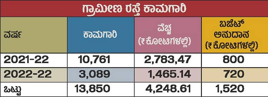 2021–22 ಮತ್ತು 2022–23ನೇ ಸಾಲಿನ ಬಜೆಟ್ನಲ್ಲಿ ₹ 1,520 ಕೋಟಿ ಮೊತ್ತವನ್ನು ಈ ಉದ್ದೇಶಕ್ಕೆ ನೀಡಲಾಗಿತ್ತು. ಈ ಆರ್ಥಿಕ ವರ್ಷದಲ್ಲಿ ರಾಜ್ಯ ಸರ್ಕಾರ ₹ 4,248.61 ಕೋಟಿ ವೆಚ್ಚದ ಒಟ್ಟು 13,850 ರಸ್ತೆ ಕಾಮಗಾರಿಗಳಿಗೆ ಮಂಜೂರಾತಿ ನೀಡಿದೆ.