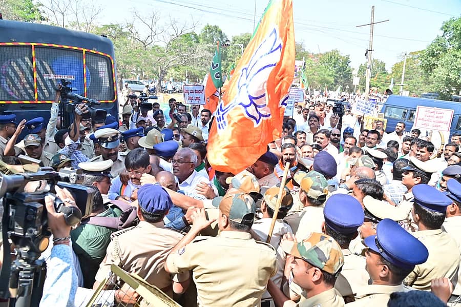 ನಗರದ ಕೆಇಬಿ ವೃತ್ತದಲ್ಲಿ ಜಮಾಯಿಸಿದ ಬಿಜೆಪಿ ಕಾರ್ಯಕರ್ತರು ಅಂಬೇಡ್ಕರ್ ಪ್ರತಿಮೆಗೆ ಮಾಲಾರ್ಪಣೆ ಮಾಡಿ ಅಲ್ಲಿಂದ ಮೆರವಣಿಗೆ ಹೊರಟರು. ಹದಡಿ ರಸ್ತೆ, ವಿದ್ಯಾರ್ಥಿ ಭವನ ವೃತ್ತದ ಮೂಲಕ ಗ್ರಾಮಾಂತರ ಪೊಲೀಸ್ ಠಾಣೆಗೆ ಮುತ್ತಿಗೆ ಹಾಕಿದರು. ಠಾಣೆಗೆ ನುಗ್ಗಲು ಯತ್ನಿಸಿದ ಪ್ರತಿಭಟನಕಾರರನ್ನು ಪೊಲೀಸರು ತಡೆದರು.