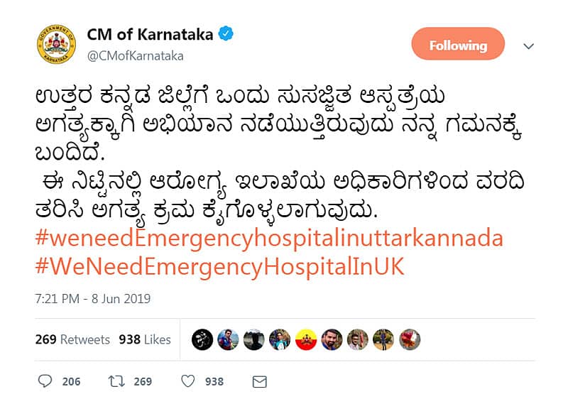 #WeNeedEmergencyHospitalInUK ಎಂಬ ಹ್ಯಾಷ್ ಟ್ಯಾಗ್ ಬಳಸಿ ಸಾಮಾಜಿಕ ಜಾಲತಾಣಗಳಲ್ಲಿ ಬೇಡಿಕೆ ಮಂಡಿಸಲಾಗುತ್ತಿದೆ. ತಮ್ಮ ಬರಹಗಳನ್ನು ಮುಖ್ಯಮಂತ್ರಿ ಕುಮಾರಸ್ವಾಮಿ, ಸಂಸದ ಅನಂತಕುಮಾರ ಹೆಗಡೆ, ಜಿಲ್ಲಾ ಉಸ್ತುವಾರಿ ಸಚಿವ ಆರ್.ವಿ.ದೇಶಪಾಂಡೆ, ವೈದ್ಯಕೀಯ ಶಿಕ್ಷಣ ಸಚಿವ ಇ.ತುಕಾರಾಮ, ಜಿಲ್ಲೆಯ ಶಾಸಕರು ಹಾಗೂ ಜಿಲ್ಲಾಧಿಕಾರಿಗಳಿಗೆ ಯುವಕರು ‘ಟ್ಯಾಗ್’ ಮಾಡುತ್ತಿದ್ದಾರೆ.