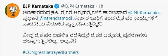 ಅಧಿಕಾರದುದ್ದಕ್ಕೂ ರೈತರ ಆತ್ಮಹತ್ಯೆಗಳಿಗೆ ಕಾರಣವಾದ ಕಾಂಗ್ರೆಸ್ ಪಕ್ಷವು ಪ್ರಧಾನಿ ನರೇಂದ್ರಮೋದಿ ಸರ್ಕಾರ ಜಾರಿಗೆ ತಂದ ರೈತ ಪರ ಕಾಯ್ದೆಗಳಿಗೆ ನಾಟಕೀಯ ವಿರೋಧ ವ್ಯಕ್ತಪಡಿಸುತ್ತಿದ್ದೀರಿ. ನೀವು ರೈತ ಪರ ಆಡಳಿತ ನಡೆಸಿದ್ದರೆ ರೈತರ ಆತ್ಮಹತ್ಯೆ ಪ್ರಕರಣಗಳು ಹೆಚ್ಚಾಗುತ್ತಿರಲಿಲ್ಲ, ಅಲ್ಲವೇ? ಎಂದು ಬಿಜೆಪಿ ಟ್ವಿಟ್ಟರ್ನಲ್ಲಿ ಪ್ರಶ್ನಿಸಿದೆ.